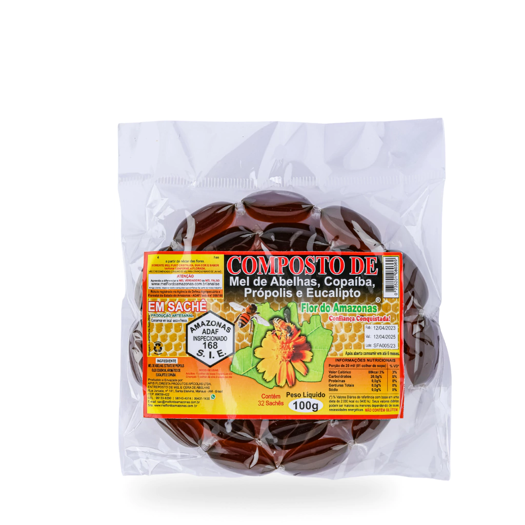 Composição: Mel puro, óleo de copaíba, extrato de própolis e óleo de eucalipto.