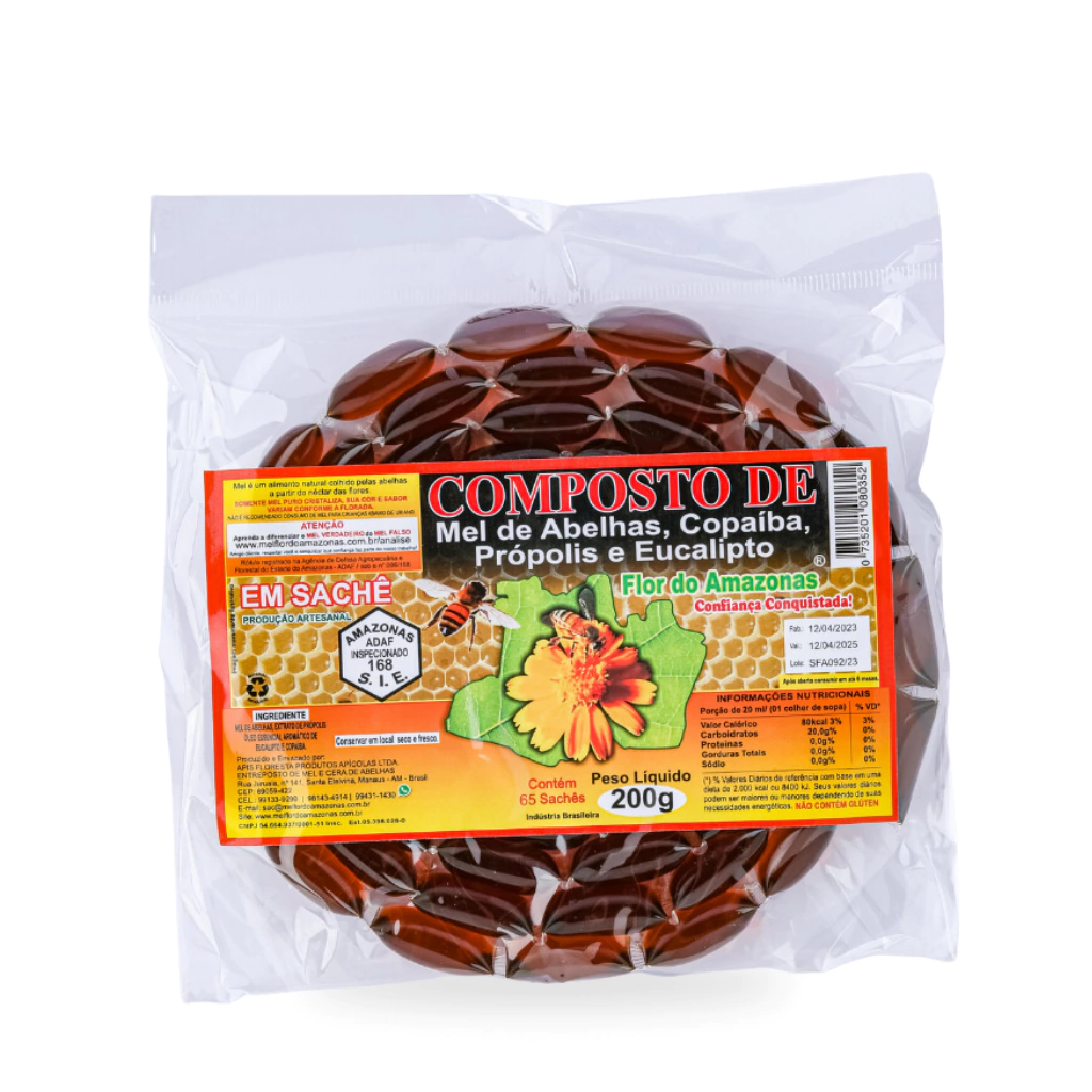 Composição: Mel puro, óleo de copaíba, extrato de própolis e óleo de eucalipto.